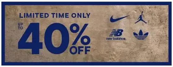 Limited time only! Shop in store and get all sale shoes, clothing & accessories up to 40% off.